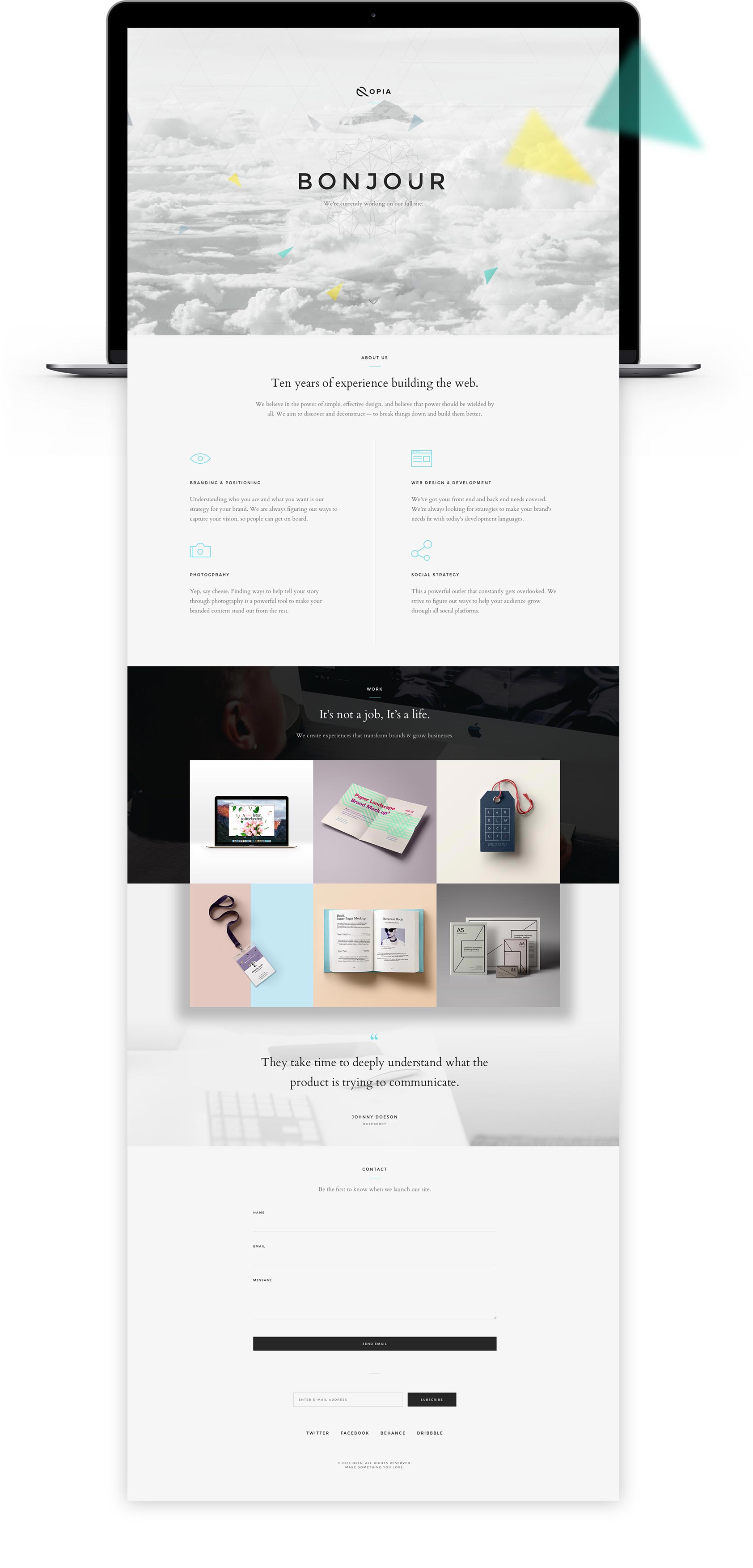 A clear cut design structure with some attractive and engaging 3D parllax effects make Opia an experince that compels users to interact with the web site in some way.